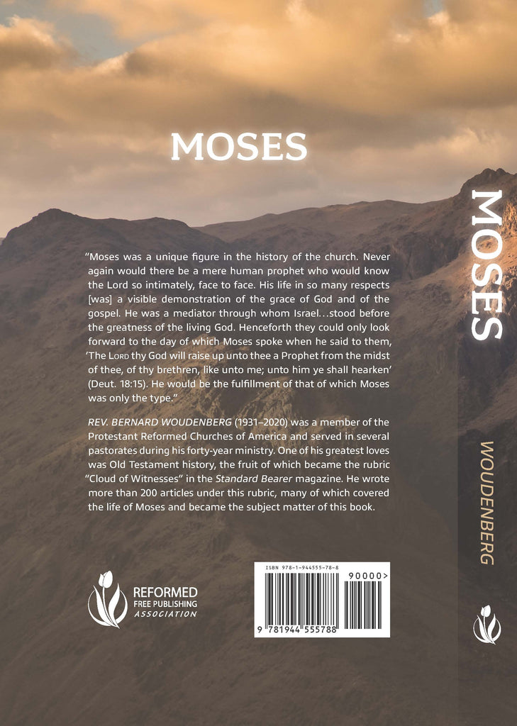Bernard Woudenberg (1931–2020) was a member of the Protestant Reformed Churches of America and served in several pastorates during his forty-year ministry. One of his greatest loves was Old Testament history, the fruit of which became the rubric “Cloud of Witnesses” in the Standard Bearer magazine. He wrote more than 200 articles under this rubric, many of which covered the life of Moses and became the subject matter of Moses.