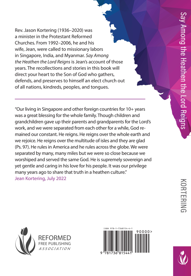 From 1992–2006, Rev. Jason Kortering and his wife, Jean, were called to missionary labors in Singapore, India, and Myanmar. Say Among the Heathen the Lord Reigns is Jean’s account of those years. The author originally wrote this collection of stories to her grandchildren to tell about the Lord’s work of calling His children out of darkness into His marvelous light in several Asian countries. Say Among the Heathen is not a full, year by year narrative of the decade when the Korterings lived in Singapore. But it is a collection of stories from 1992-2002 as well as several years after that when they returned during retirement. The recollections and stories in this book will direct your heart to the Son of God who gathers, defends, and preserves to himself an elect church out of all nations, kindreds, peoples, and tongues.