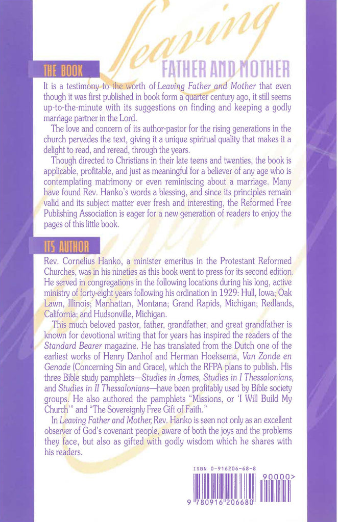 "Much common sense and biblical wisdom is to be found in this little book. It is specially directed at Christians in their late teens and early twenties. How careful young people must be to seek the guidance or God with regard to a spouse! In a day when sex before marriage is regarded as the norm it is good to have the teaching of the Bible on moral purity clearly spelled out. The emphasis that is laid on the interest of the whole congregation in a member’s marriage is also wholesome. It is a common saying that 'love is blind' but Hanko advises to enter marriage with both eyes open. Thereafter it is best to shut one eye!" - W. Macleod