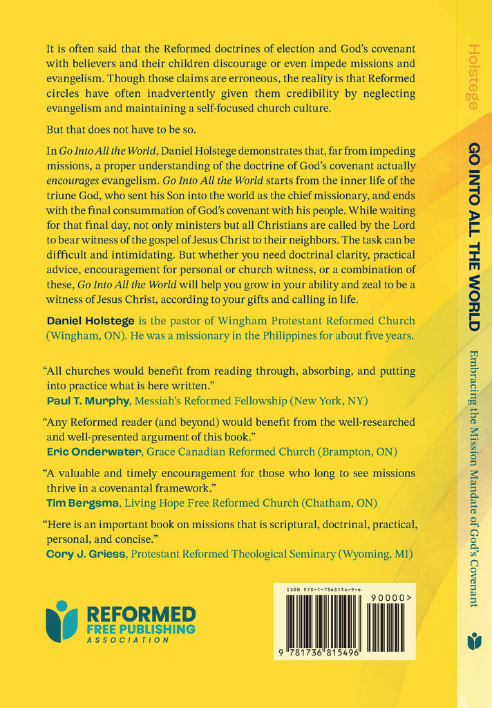 “Here is an important book on missions that is scriptural, doctrinal, practical, personal, and concise. What a unique and important work! God’s people will be blessed as Daniel Holstege recounts his experiences as a missionary to the Philippines and his own personal development in love for the mission mandate of the church, all while carefully expounding that mandate for our benefit. Avoiding an imbalanced position, Rev. Holstege has developed a mature and holistic view of God’s purposes that can be of great help to the church and the individual child of God. May God use it to grow many in love for Him and the fullness of His covenant!” —Cory J. Griess, Professor of Practical Theology and New Testament Studies Protestant Reformed Theological Seminary (Wyoming, MI)