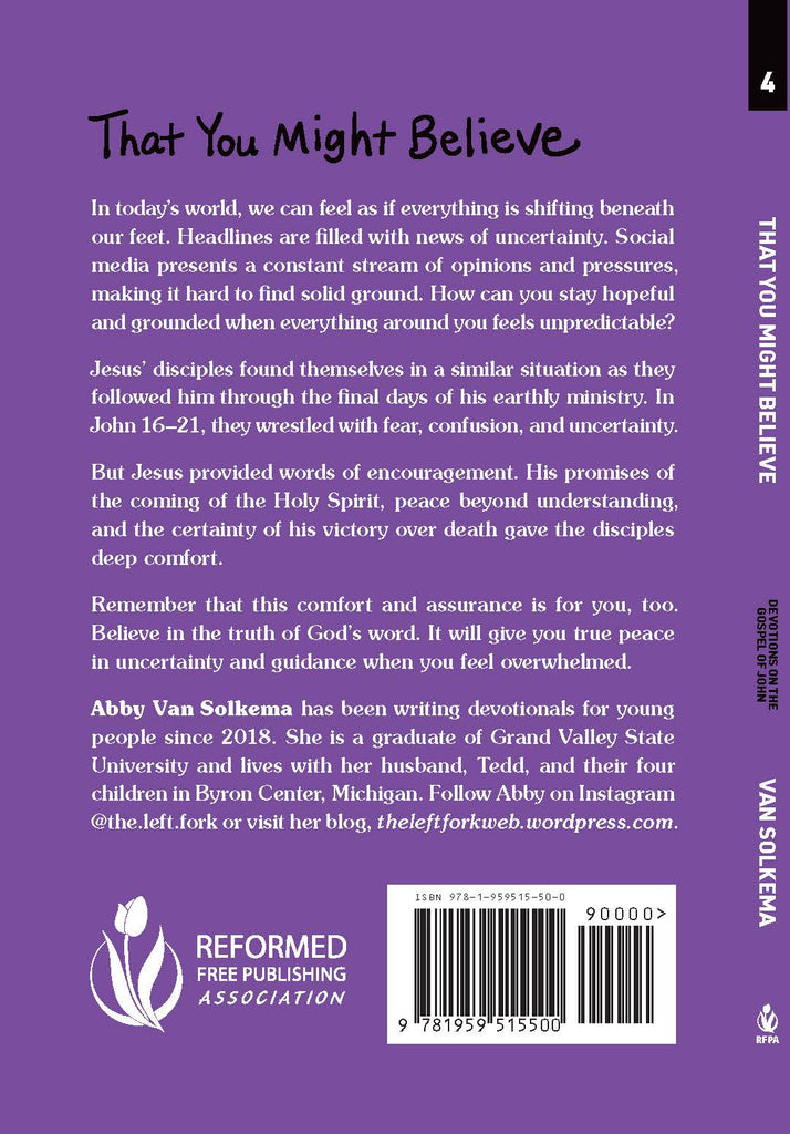 Abby Van Solkema has been writing devotionals for young people since 2018. She is a graduate of Grand Valley State University and lives with her husband, Tedd, and their four children in Byron Center, Michigan. Follow Abby on Instagram @the.left.fork. or visit her blog, theleftfork.wordpress.com, to read more of her work.